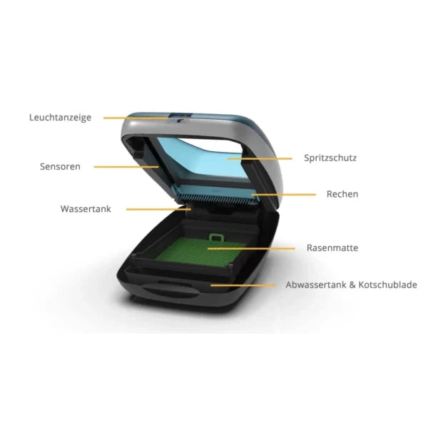 After leaving the vehicle, the cleaning process starts automatically: The droppings lying on the tips of the grass mat are deposited into the waste container by a rake. The container lid opens just before the droppings are made and closes tightly immediately afterward. When returning, the grass mat is cleaned by nozzles integrated into the rake. The wastewater flows into an easy-to-empty tank.